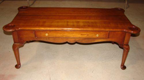 QUEEN ANNE STYLE CHERRY COFFEE TABLE. Has four cupholders & single drawer. 17” H, 43.75” L, 22” W