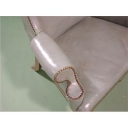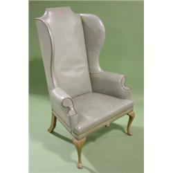 QUEEN ANNE STYLE LEATHER WING CHAIR. Has slight tear in seat. Pad feet. High back seat. 51"H, 32"W, 18" tall to the top of seat.