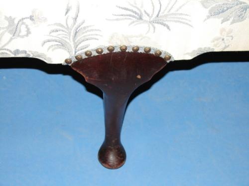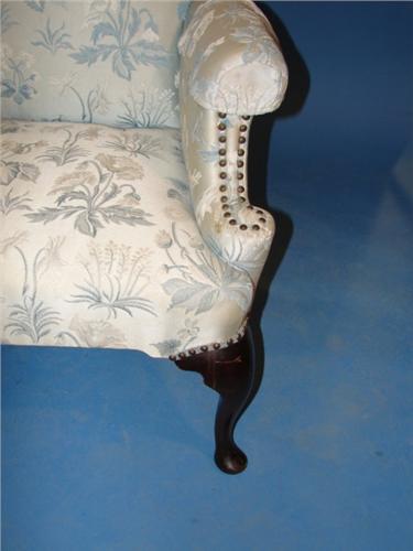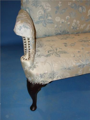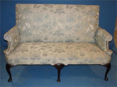 QUEEN ANNE STYLE LOVESEAT. Pad feet. Blue brocade upholstery with floral decoration. 40.5” H to top of back, 63” L, 24” D
