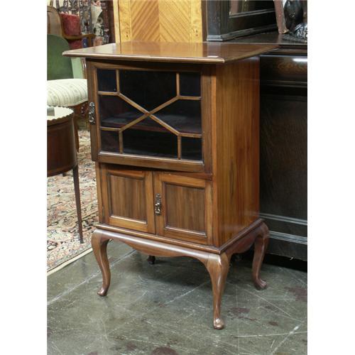 DISPLAY CABINET: Queen Anne style mahogany small display cabinet, glass door encloses inner shelf, formed skirt, cabriole legs. 35''h x 16''d x 25''w