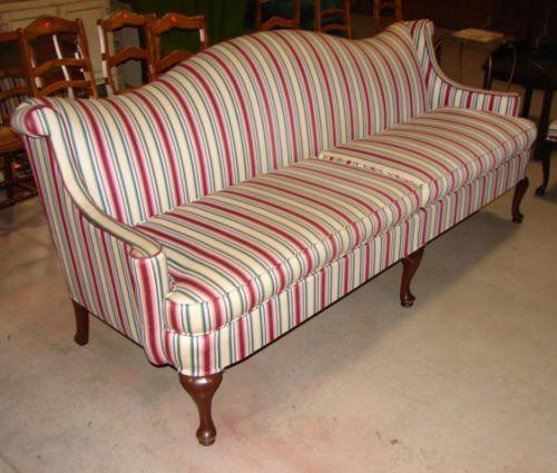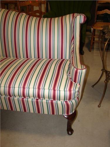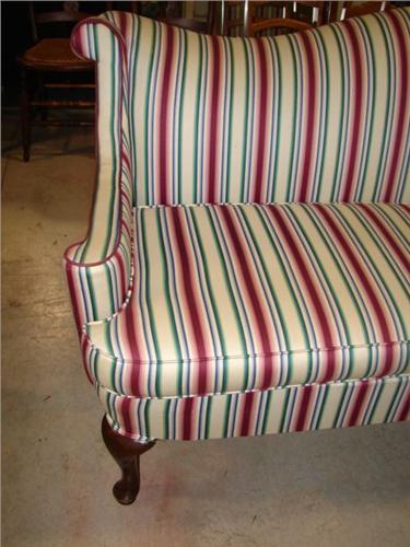 QUEEN ANNE STYLE CAMELBACK SOFA. Two cushion seat. Has cream & green, blue, & rose stripe decoration upholstery. 35.5” H to top of back, 85” L