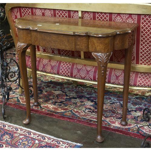 CONSOLE TABLE: Queen Anne style walnut and burlwood console table, scalloped and molded top and apron, cabriole legs with carved shell knees and pad feet. table measures 32''h x 16''d x 36''w