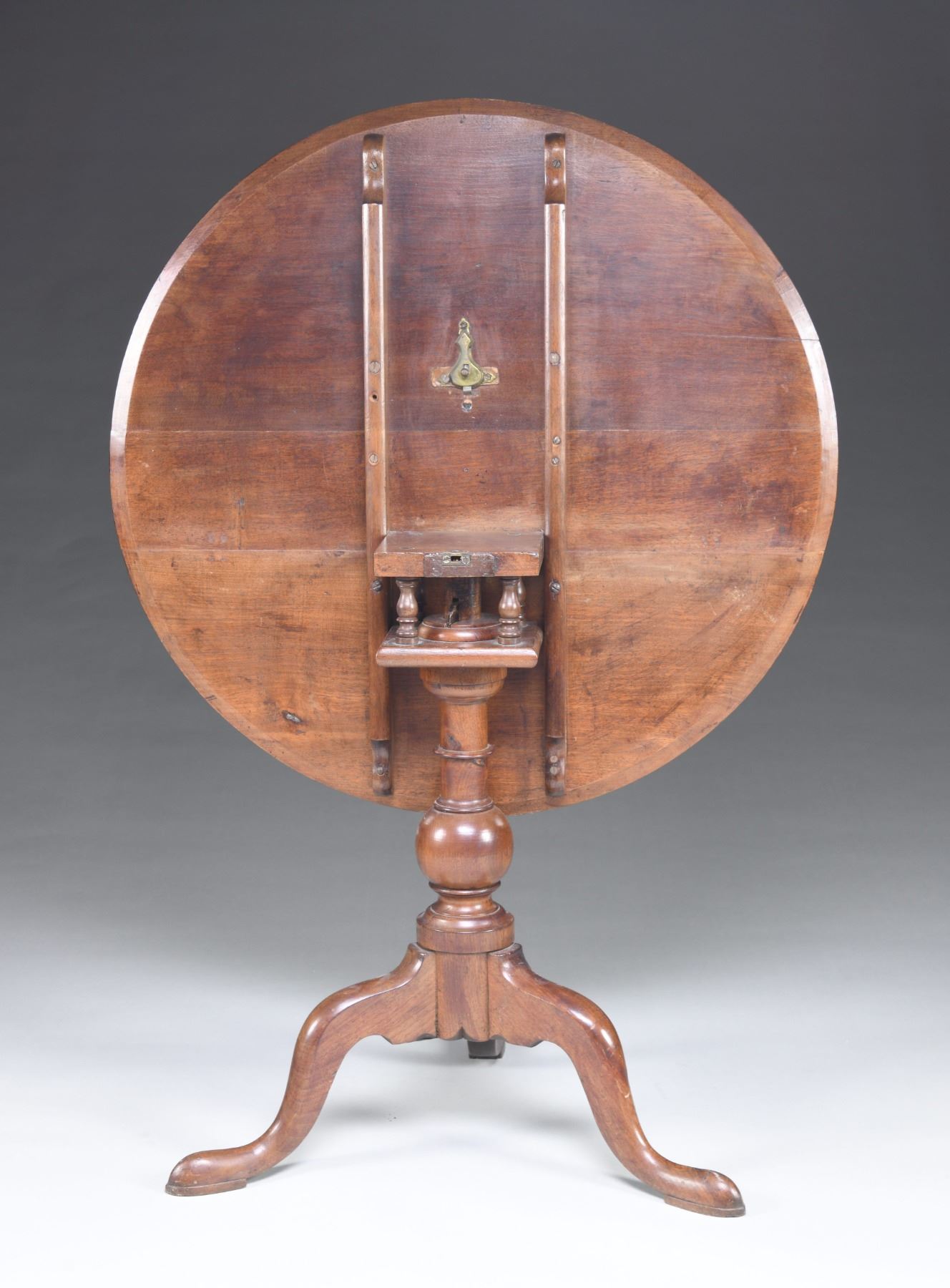 Mid-18th century, Pennsylvania. The round molded top hinged on a birdcage support, joined and swiveling on a baluster turned pedestal raised on a cabriole leg base terminating in shaped pad platform feet. SIZE: 29" h x 33" dia. CONDITION: top has been professionally restored and polished. The pedestal base retains original iron braces set within the base of the pedestal. NOTE: has old replacement 7" center strip. PROVENANCE: Pennsylvania Estate Collection. (05-832/TG). $300-500.