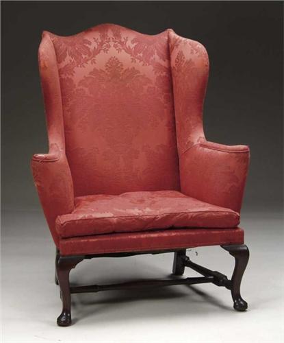 QUEEN ANNE WINGBACK EASY CHAIR. Colonial style wingback. Mid 20th Century. Branded on rear leg with Colonial Williamsburg Kittinger mark. Red flower upholstery. SIZE: 45” h x 36” across. CONDITION: Very good. Some wear to upholstery on arms. 9-26631