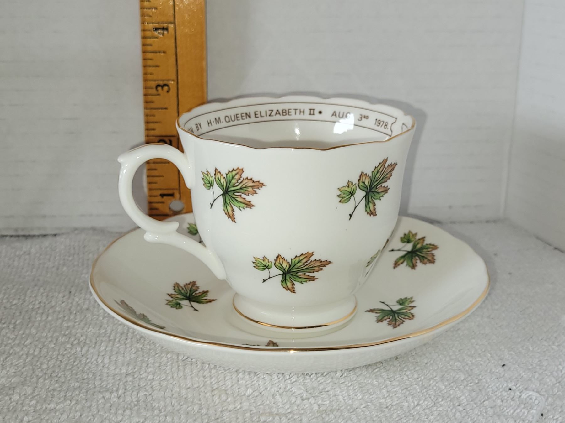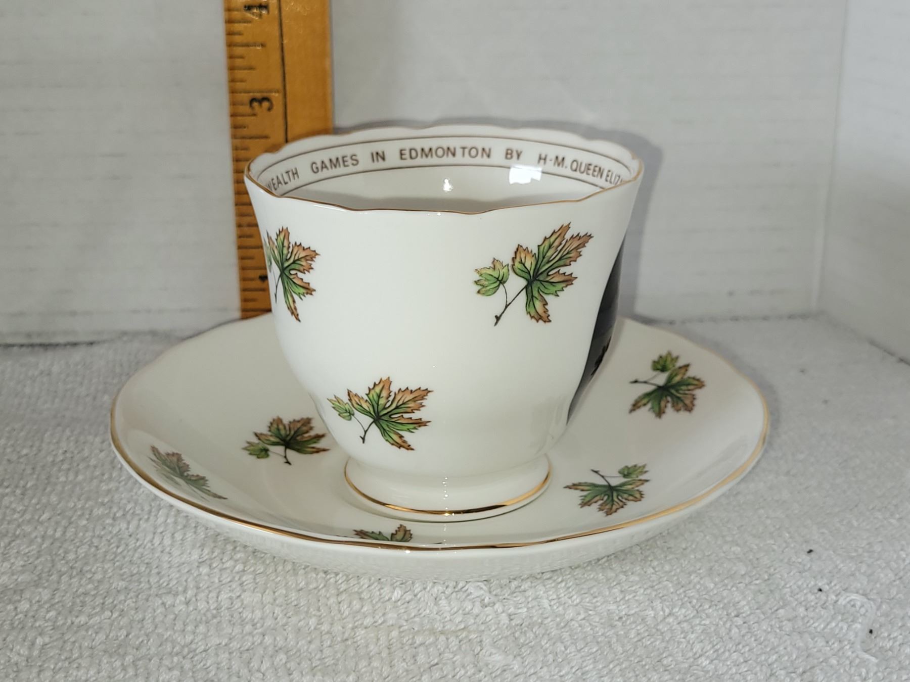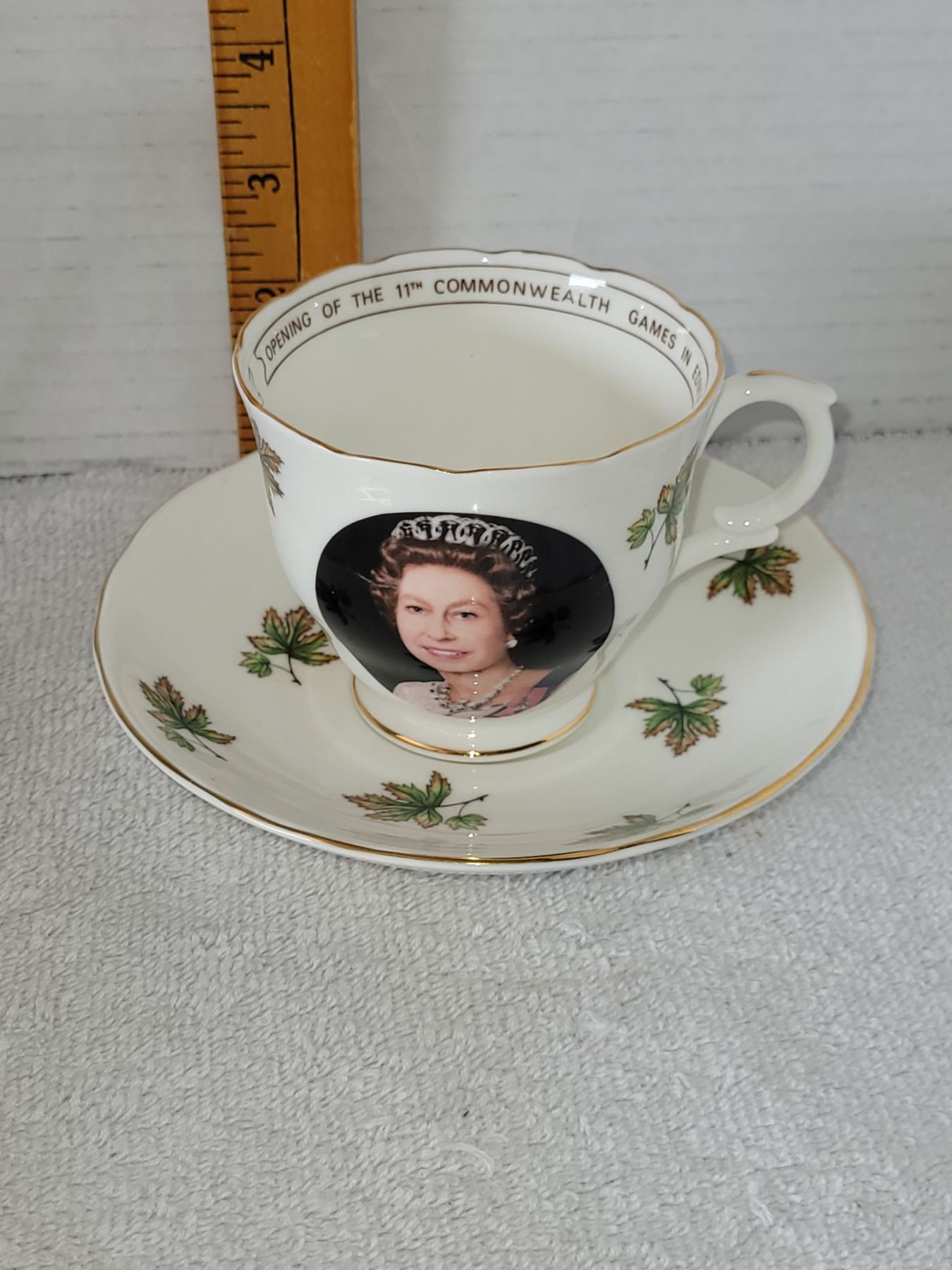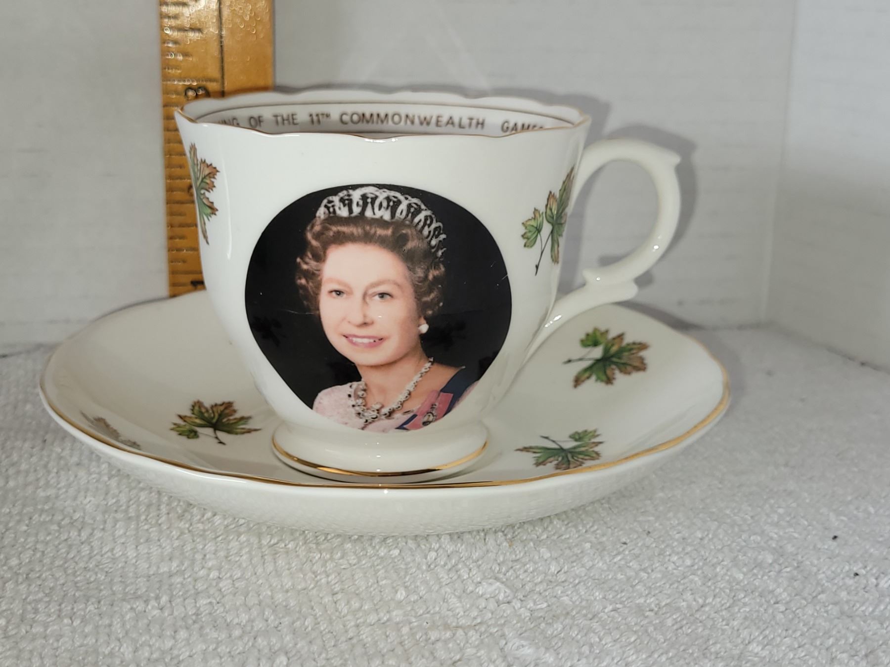 QUEEN ELIZABETH II 1978 IITH COMMONWEALTH GAMES CUP AND SAUCER SET. CORWN STAFFORDSHIRE CHINA