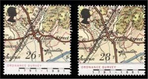 1991 Bicentenary of the Ordnance Survey, the 26p value which was reported to have been issued at a post office in Hastings, this stamp was replaced by a 28p in the same design (which accompanies it) following an increase in postage rates, it is believed