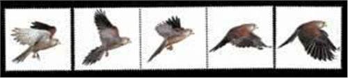 2003 Birds of Prey: Five 1st class (two singles and strip of three showing the Kestrel in flight each with var Queens Head and value omitted (SG 2332-2336 vars) one pulled perf and minor gum bends otherwise fine u/m
