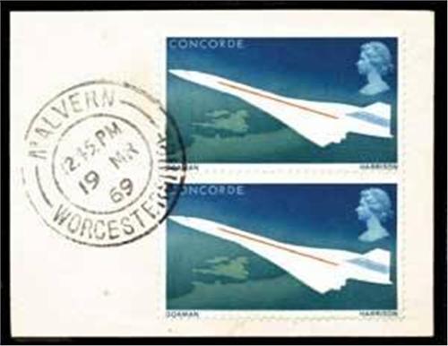 1969 First Flight of Concorde, 4d with violet omitted (SG784a) vert pair tied to small piece by Malvern cds for 19 Mr 69, one sheet of 120 was originally found, very few were used, with 1992 RPS cert