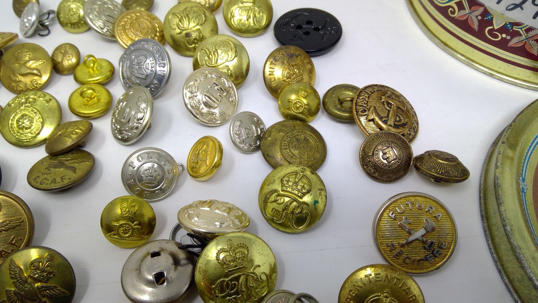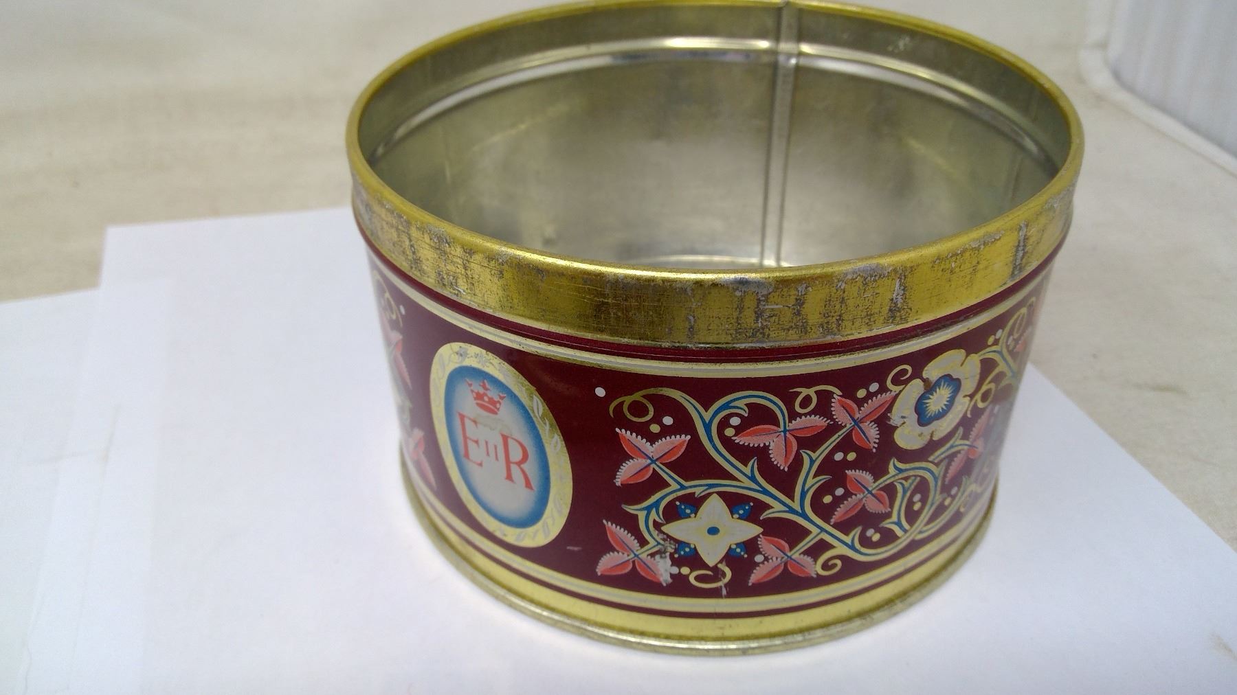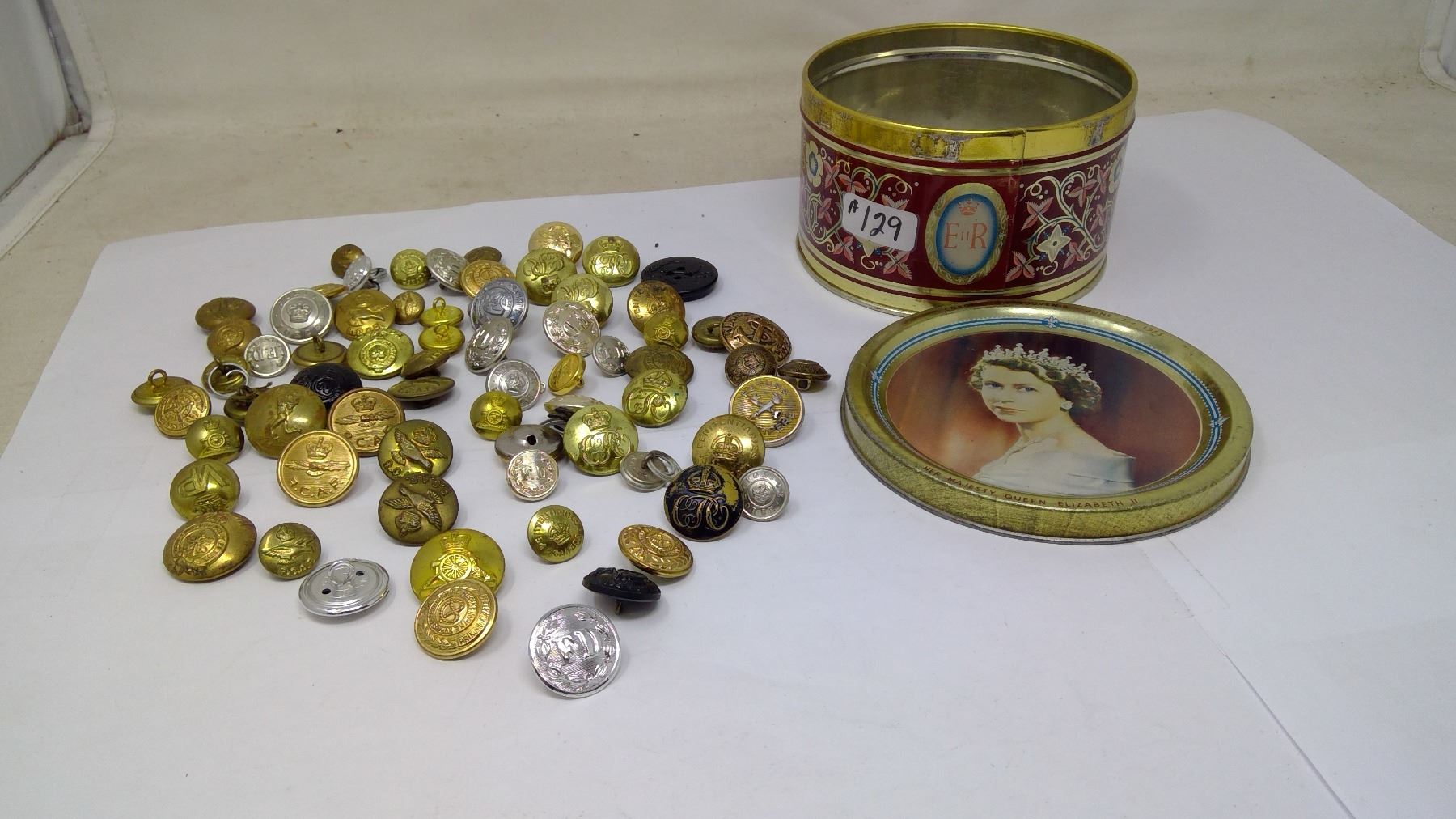 QUEEN ELIZABETH TIN WITH MILITARY BUTTONS