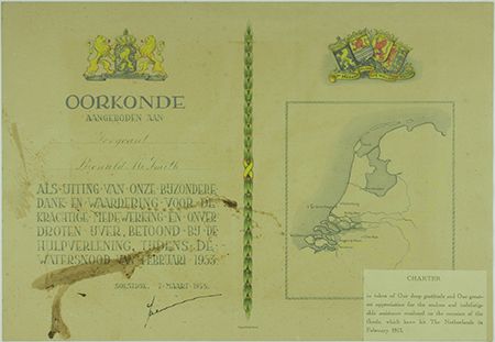 (1909 - 2004) Queen regnant of the Kingdom of the Netherlands between 1948 and 1980. D.S. 1p. oblong sm. folio, Soestduk, Mar. 7, 1953, a certificate signed by the queen in recognition of the service an American sergeant offered her country during devastating floods earlier the same year. Large stain affects the text of the award, estimated accordingly.