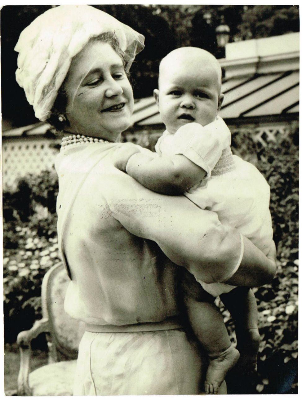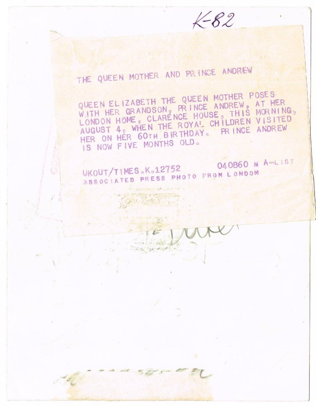 A vintage press photo of the Queen Mother and Prince Andrew in 1960 at Clarence house on August 4. Size: 7.75 x 6 inches.