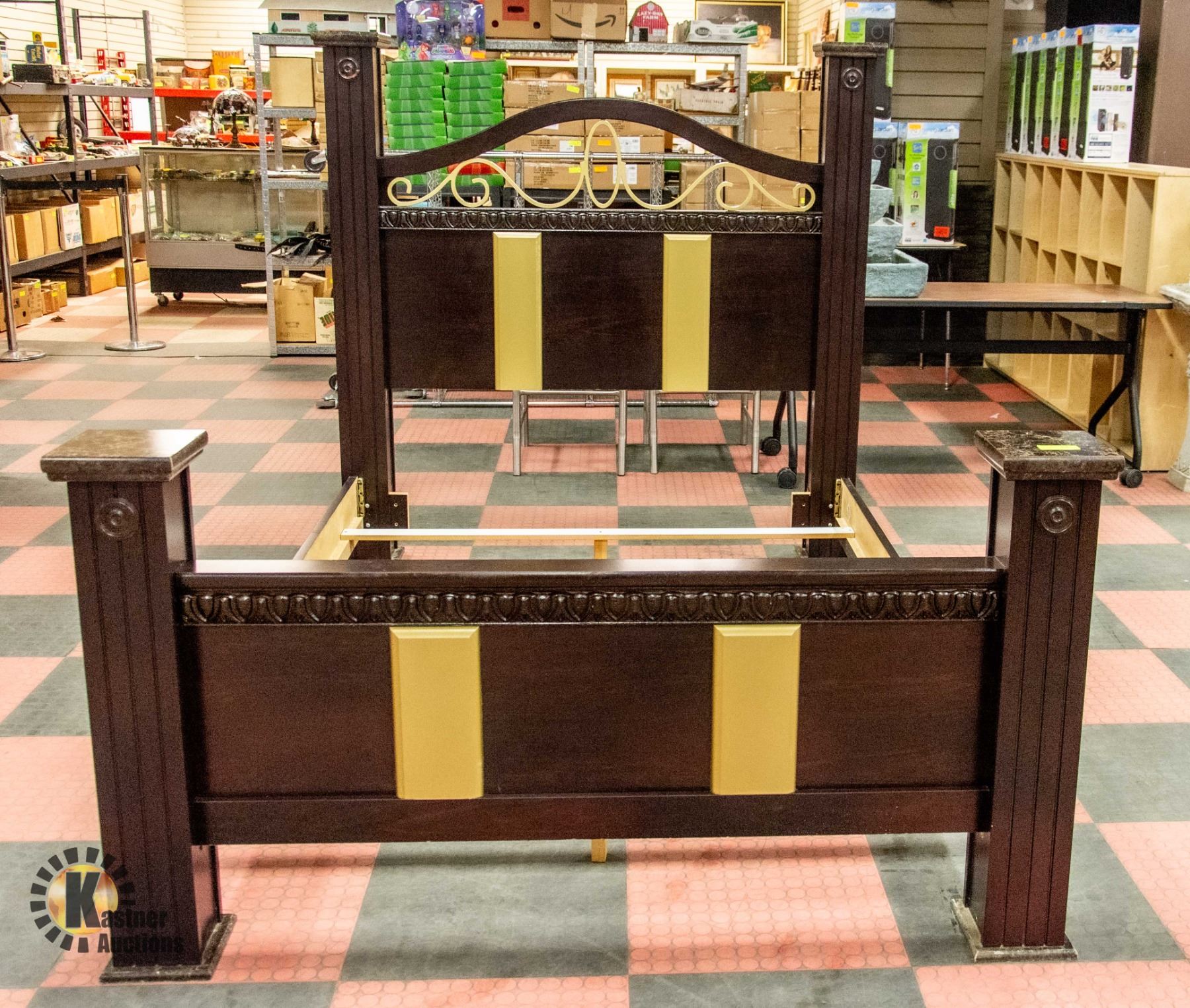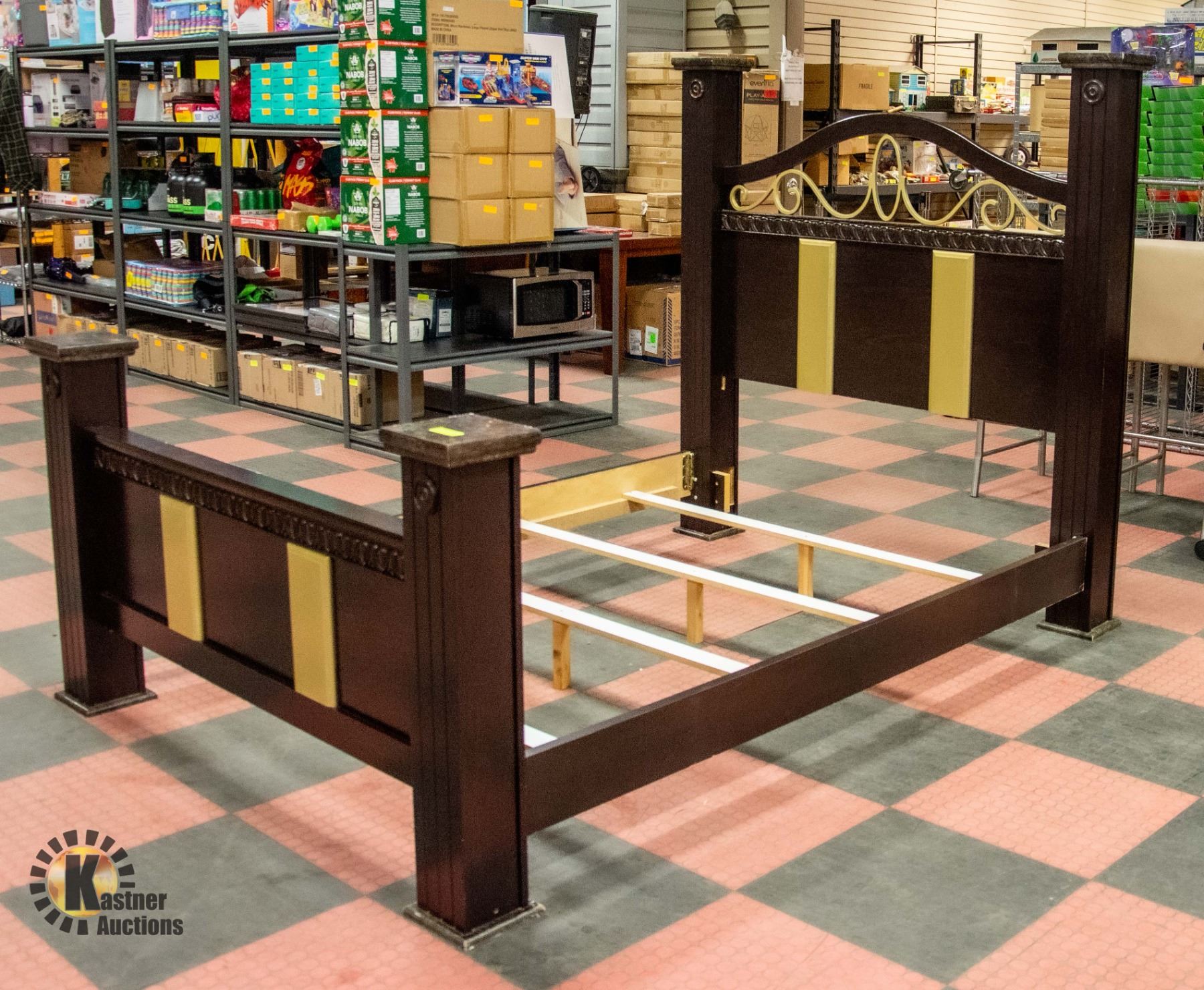 GOLD ACCENTS & SOLID WOOD SIDE RAILS (66"W X 92"L X 64"H- HEADBOARD POST) **ALL ITEMS MUST BE REMOVED BY 5PM SATURDAY, MAY 6TH 2023. ALL REMAINING ITEMS WILL BE SUBJECT TO A $6.00 PER DAY STORAGE CHARGE. ANY ITEMS REMAINING AFTER MONDAY, MAY 22ND, 2023 WILL BE CONSIDERED FORFEITED. NO REFUNDS WILL BE ISSUED FOR FORFEITED ITEMS. TO SCHEDULE A PICK UP APPOINTMENT CLICK HERE