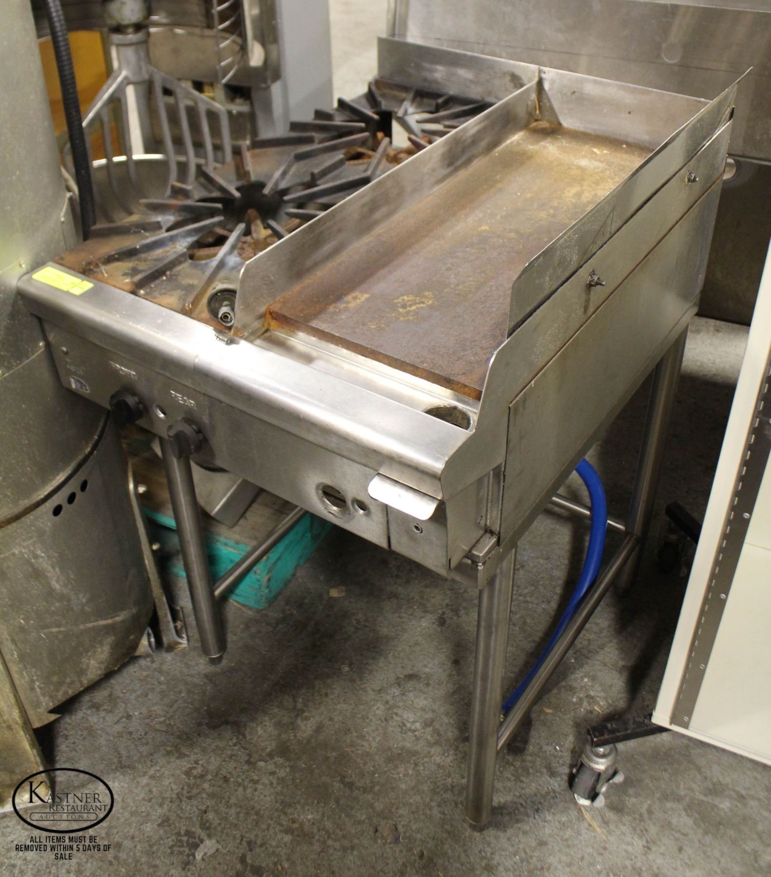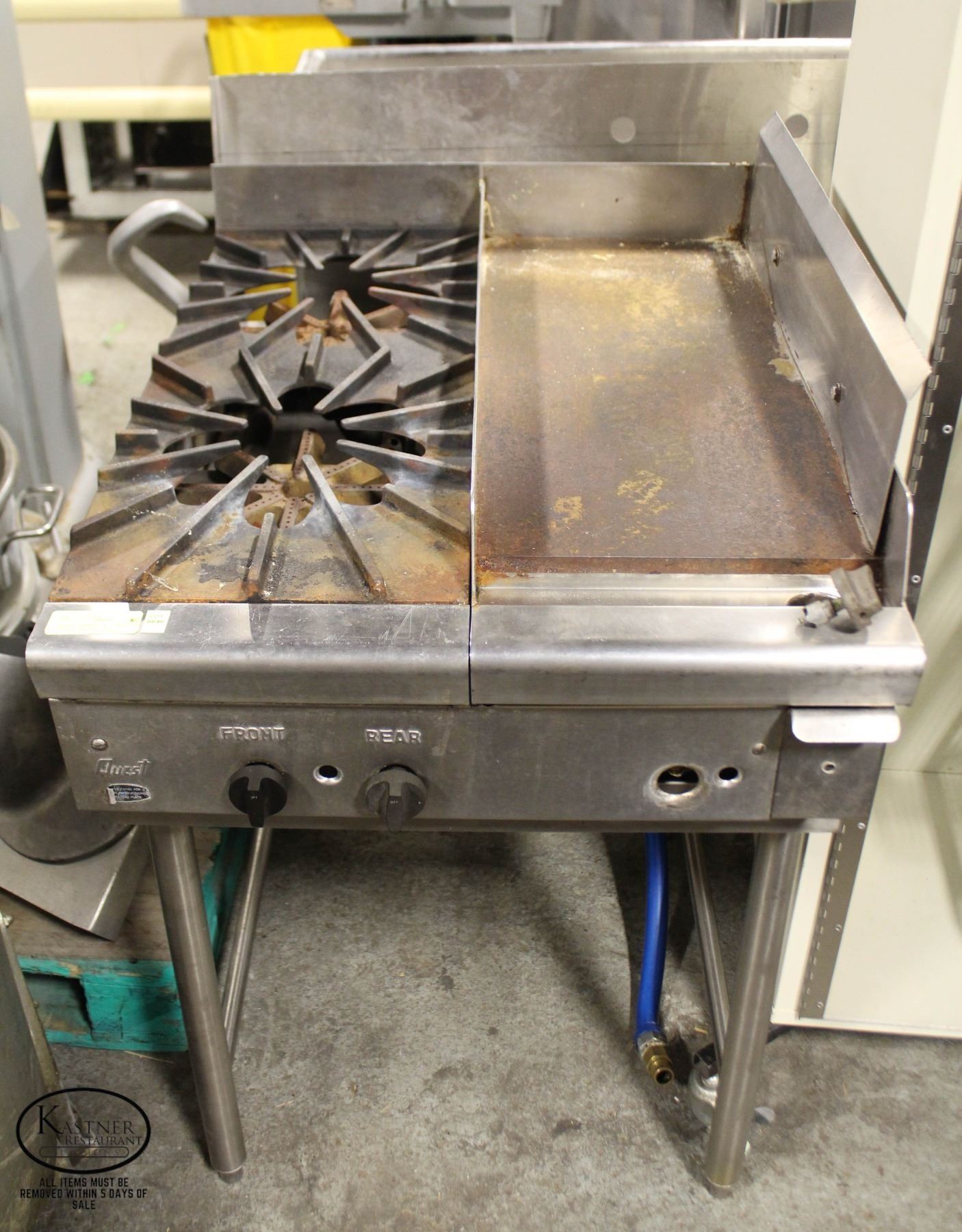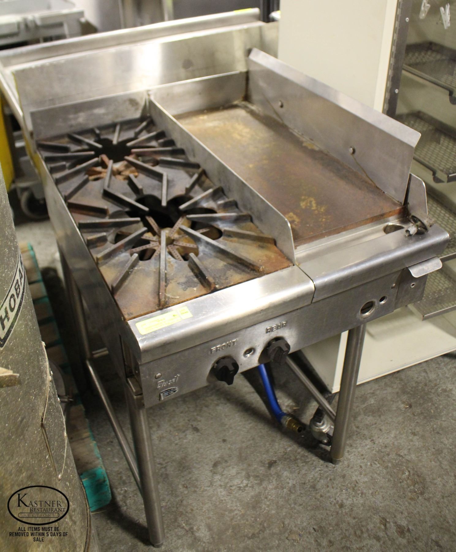 2 BURNER & FLAT TOP GRILL: 11-3/4" X 26" (1/2" THICK PLATE) TOTAL DIMENSIONS: 24" X 31" X 36"**ALL ITEMS MUST BE REMOVED BY 5PM MONDAY, FEBRUARY 6TH, 2023. ALL REMAINING ITEMS WILL BE SUBJECT TO A $6.00 PER DAY STORAGE CHARGE. ANY ITEMS REMAINING AFTER MONDAY, FEBRUARY 20TH, 2023 WILL BE CONSIDERED FORFEITED. NO REFUNDS WILL BE ISSUED FOR FORFEITED ITEMS.** TO SCHEDULE A PICK UP APPOINTMENT CLICK HERE