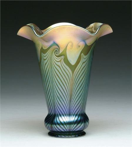 QUEZAL ART GLASS SHADE. Iridescent green and gold hooked feather decoration with ruffled edges. SIZE: 5-1/2 in. dia x 6-3/4 in. t x 2-14 in. fitter. CONDITION: Shade has been damaged and glued back together. Estate of Jon Heiden and Donald Mooers 5-60695