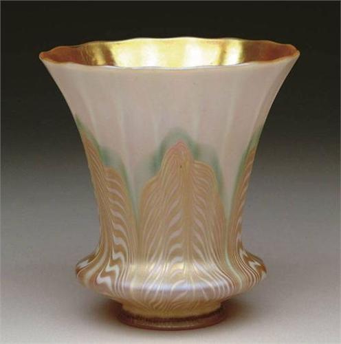 QUEZAL ART GLASS SHADE. Nicely decorated art glass shade has a gold pulled-feather pattern with green border on an ivory ground and is nicely ribbed. Signed “Quezal”. SIZE: 2-1/4” fitter x 5-1/2" t. CONDITION: Very good to excellent. 5-61680