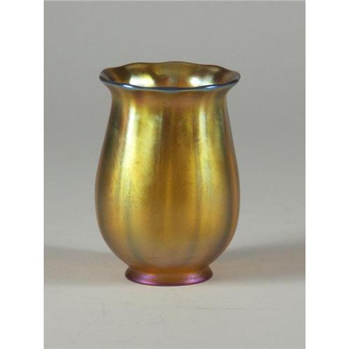 ART NOUVEAU SHADE: A single signed Quezal light shade. The Quezal Art Glass and Decorating Company was an important contributor to American Art Nouveau glass from 1902-1924 and a competitor of Tiffany glass. The shade is iridescent gold, ribbed, flared base, neck opening from outside edge 2'' approximately x 5'' high x 3.25'' at the widest point, early 20th c.