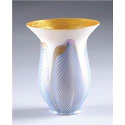 Lot 172 QUEZAL BLUE PULLED FEATHER SHADE Beautiful Quezal shade has pastel blue pulled feather design with gold iridescent trim. Iridescent trim shows flashes of blue and raspberry. Interior of shade is rich gold iridescent. Signed inside fitter rim “Quezal”. SIZE: 6” t x 4-7/8” dia. CONDITION: Very, very minor roughness to fitter rim, otherwise very good to excellent. 5-70417