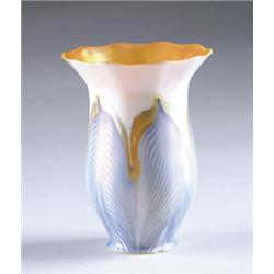 Lot 173 QUEZAL BLUE PULLED FEATHER SHADE Beautiful Quezal shade has pastel blue pulled feather design with gold iridescent trim. Iridescent trim shows flashes of blue and raspberry. Interior of shade is rich gold iridescent and shades to greenish yellow at fitter. Signed inside fitter rim “Quezal”. SIZE: 6” t x 4-7/8” dia. CONDITION: Chip to fitter rim, otherwise very good to excellent. 5-70418