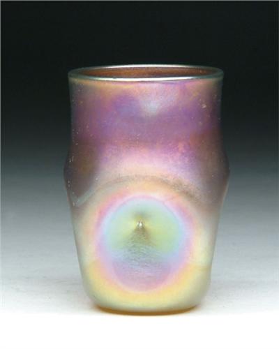 QUEZAL CABINET VASE. Nice signed "Quezal" cabinet vase is iridescent gold with purple highlights and four pinched in sides. SIZE: 3 in. t. CONDITION: Very good to excellent. 5-60824