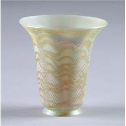 Lot 163 QUEZAL DECORATED ART GLASS SHADE R#8. Allover green feather decoration with gold random threading marvered in flush. Signed “Quezal”. SIZE: 2-1/4: fitter x 5-1/4” t. CONDITION: One chip to fitter rim. 5-70408