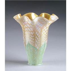 Lot 204 QUEZAL DECORATED SHADE Similar to R#11. Seafoam green feathered decoration complimented by gold fishnet design on opal glass with gold interior. Deeply scalloped and stretched border. Signed “Quezal”. SIZE: 2” fitter x 7-1/4” t x 6” w. CONDITION: Very minor imperfections in the making. 5-70450