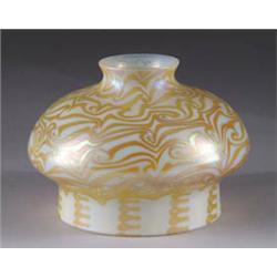 Lot 230 QUEZAL HARP LAMP SHADE Beautiful Quezal opal shade has gold King Tut and zipper decoration with flashes of lavender iridescence. Early “Quezal” signature in fitter rim. SIZE: 4-1/2” t x 6-1/8” dia. CONDITION: Very good to excellent. 5-71025