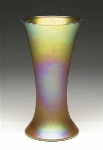 QUEZAL IRIDESCENT VASE. Nice Quezal vase is iridescent gold with purple highlights. Signed on underside "Quezal". SIZE: 10-1/4" t. CONDITION: Very good to excellent. 5-62113