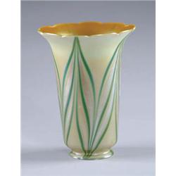 Lot 182 QUEZAL PULLED FEATHER SHADE Beautiful Quezal shade has light green background with a hint of gold iridescence and pulled feathers of gold iridescence and dark green. Interior of shade is rich gold iridescence. Signed inside fitter “Quezal”. SIZE: 6-1/4” t x 4-3/4” dia. CONDITION: Small chip to fitter rim and some minor scratches to pulled feather design. 5-70428
