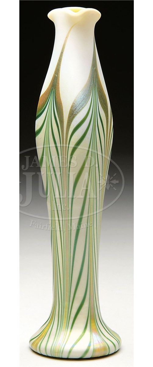 Quezal three-sided flower form vase has green pulled feather design ascending from the foot. Each pulled feather is outlined in gold iridescence and set against a creamy white background. Vase is finished with a yellow interior and signed on the underside "Quezal". SIZE: 10" t. CONDITION: Very good to excellent. 5-67039