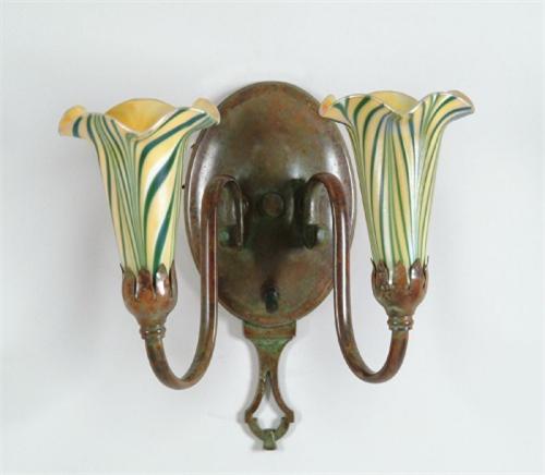 QUEZAL WALL SCONCE. Wonderful bronze Art Nouveau wall sconce has rich brown patina with green mottled highlights with two curving arms which support two signed "Quezal" lily shades. The shades feature green pulled feather design against a yellow lightly iridescent background. The interior of each shade is a bright gold iridescence. SIZE: Sconce extends 5-1/2 in. from the wall. Overall height is 9 in. CONDITION: One shade has large chip out of fitter which is concealed when shade is in place. Estate of Jon Heiden and Donald Mooers 5-60676