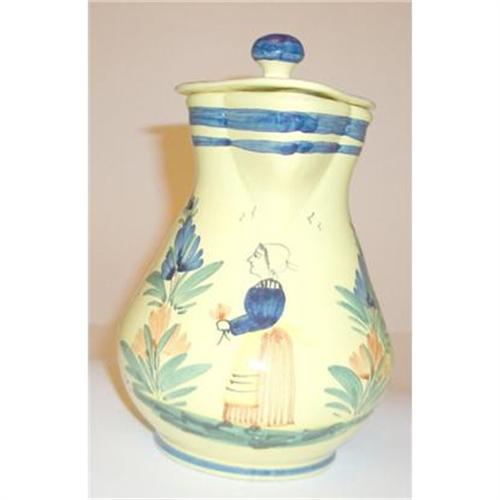 This lovely Quimper Pitcher is 8 inches high with a shaped lid. It has the traditional peasant woman on the very front with flowers on each side. The lid has matching leaves. It is 6.5 inches from lip to handle. It is 5 inches across the front. It weighs 1.5 pounds. On the bottom is the initials HB, Quimper, France.