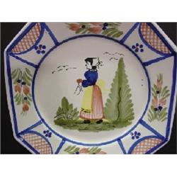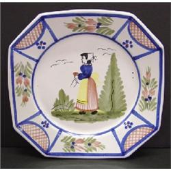 PAIR OF OCTAGONAL QUIMPER PLATES. Stamped on bottom with mark of Les Faienceries de Quimper, Quimper, France. 9” Dia.