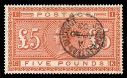 1867-83 Watermark Anchor white paper: £5 orange (SG 137) CK, fine used with South Eastern District cds, dealers/expertising mark on reverse, cat £3,500