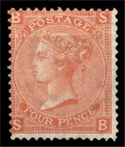 1865-67 4d vermilion plate 14 (SG 94) SB, small paper adhesion on reverse and centred slightly to the NE otherwise fine and fresh, large part o.g., cat £500