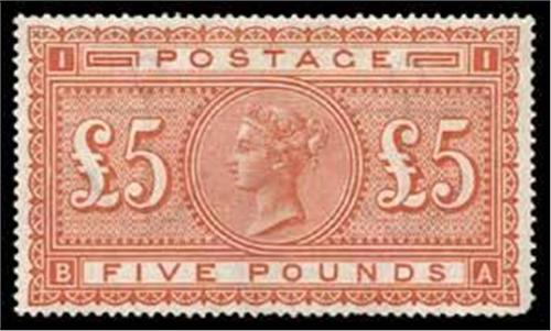 1867-83 Watermark Anchor - white paper: £5 orange (SG 137) BA, rounded cnr at SW, black mark affecting reverse of three perfs, lovely fresh large part o.g. R.P.S. Cert (1979) stating "surface scratches", cat £7,000