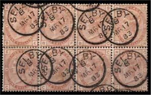 1880-83 1s orange-brown plate 14 (SG 163) block of eight (4 x 2) lettered BE-CH, cancelled by neat strikes of the Selby cds for MR.17.1883, minor imperfections and re-enforced with hinge, but still attractive and scarce multiple