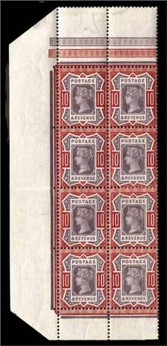 1887-92 10d dull purple and carmine (SG 210) block of eight (2 x 4) with margins top, bottom and to left, one pair re-enforced with a hinge, other stamps u/m, some light creasing nice positional piece, cat £650+