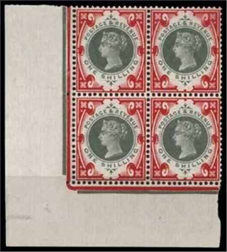 1900 1s green and carmine (SG 214) SW corner marginal block of four, odd small gum crease, fine u/m attractive positional piece, cat £320+
