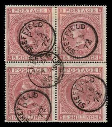 1867-83 Watermark MC 5s pale rose (SG 127) block of four AA-BB, odd slightly shortish perf, neatly cancelled by five strikes of Sheffield JA. 5. 72 cds's, a few perfs separated at right, lovely multiple, cat £3,500