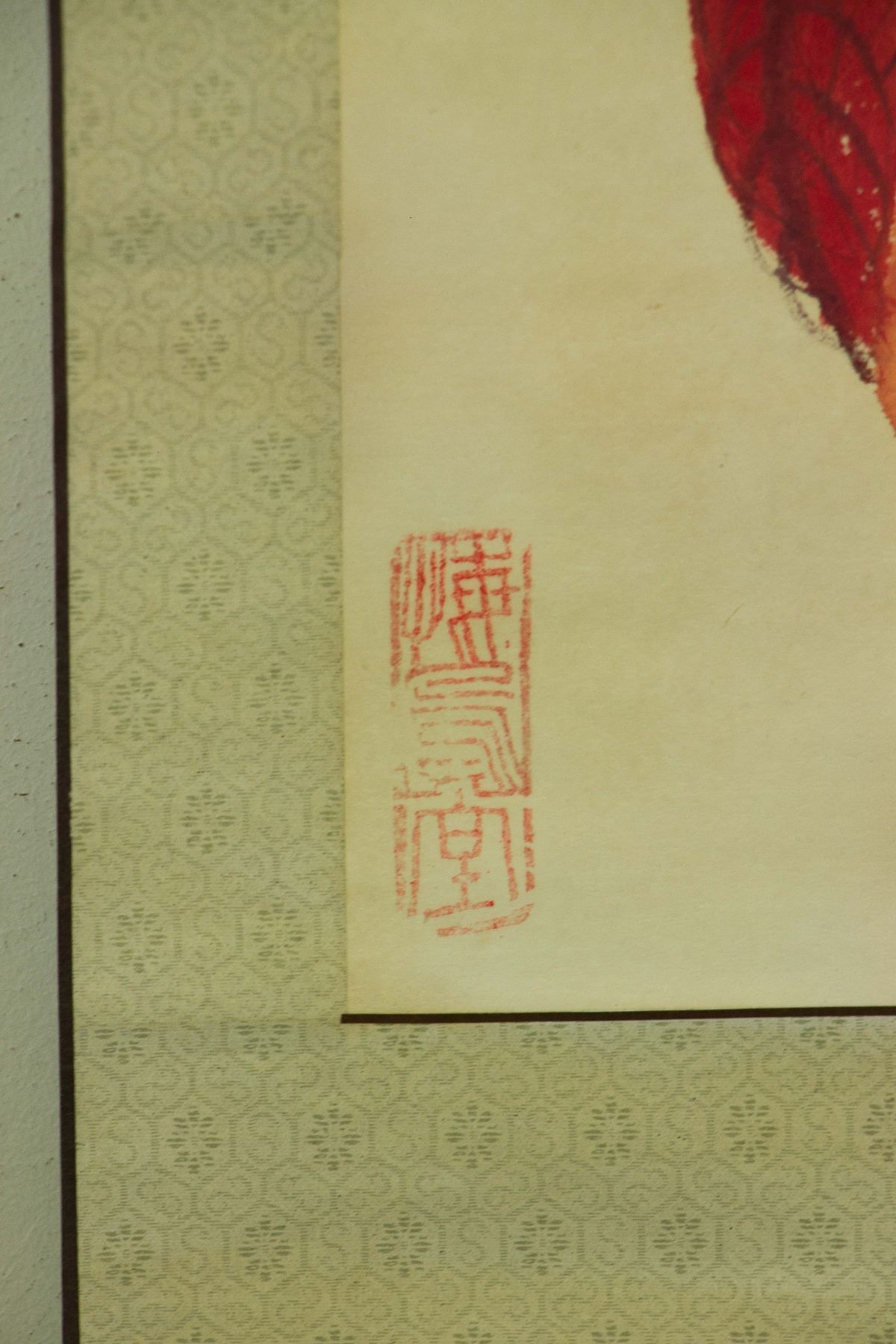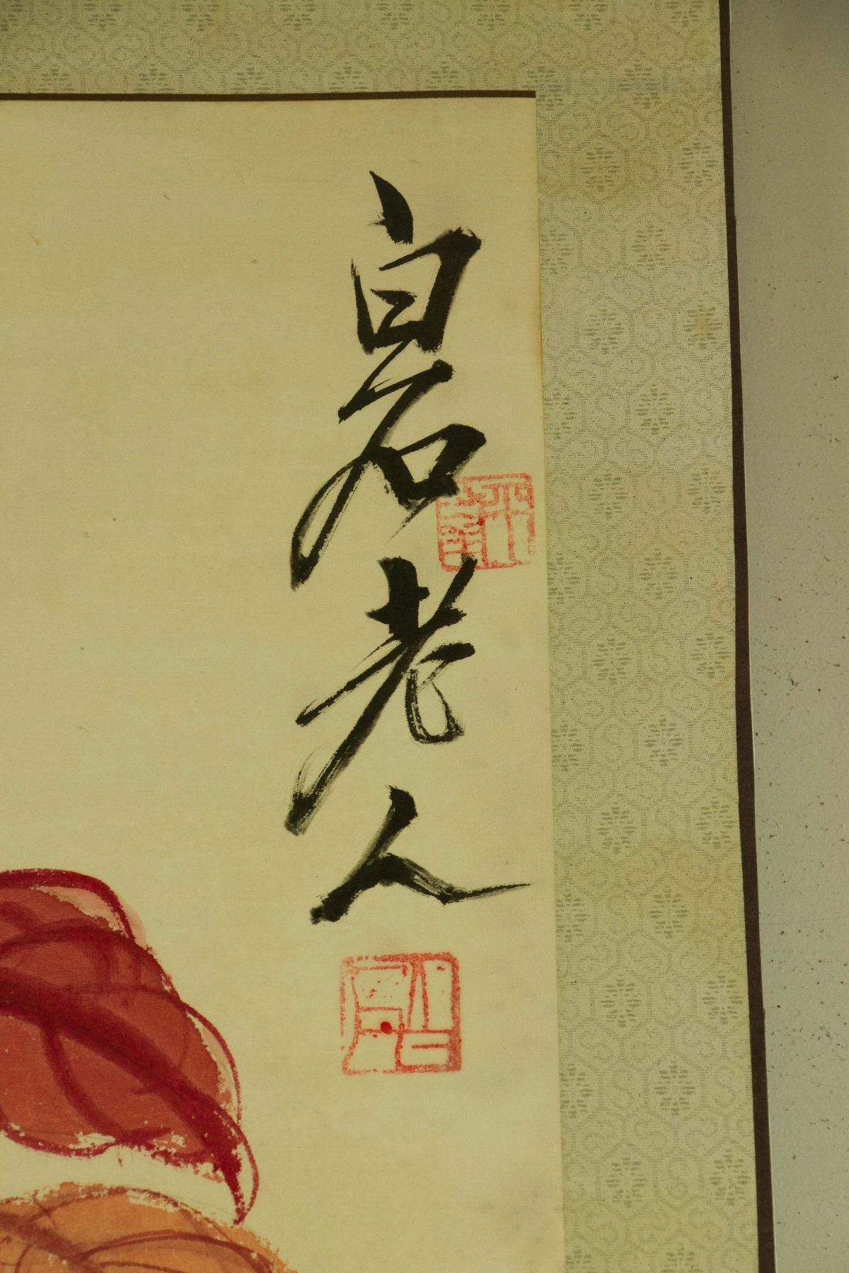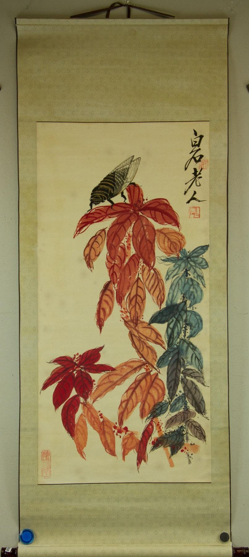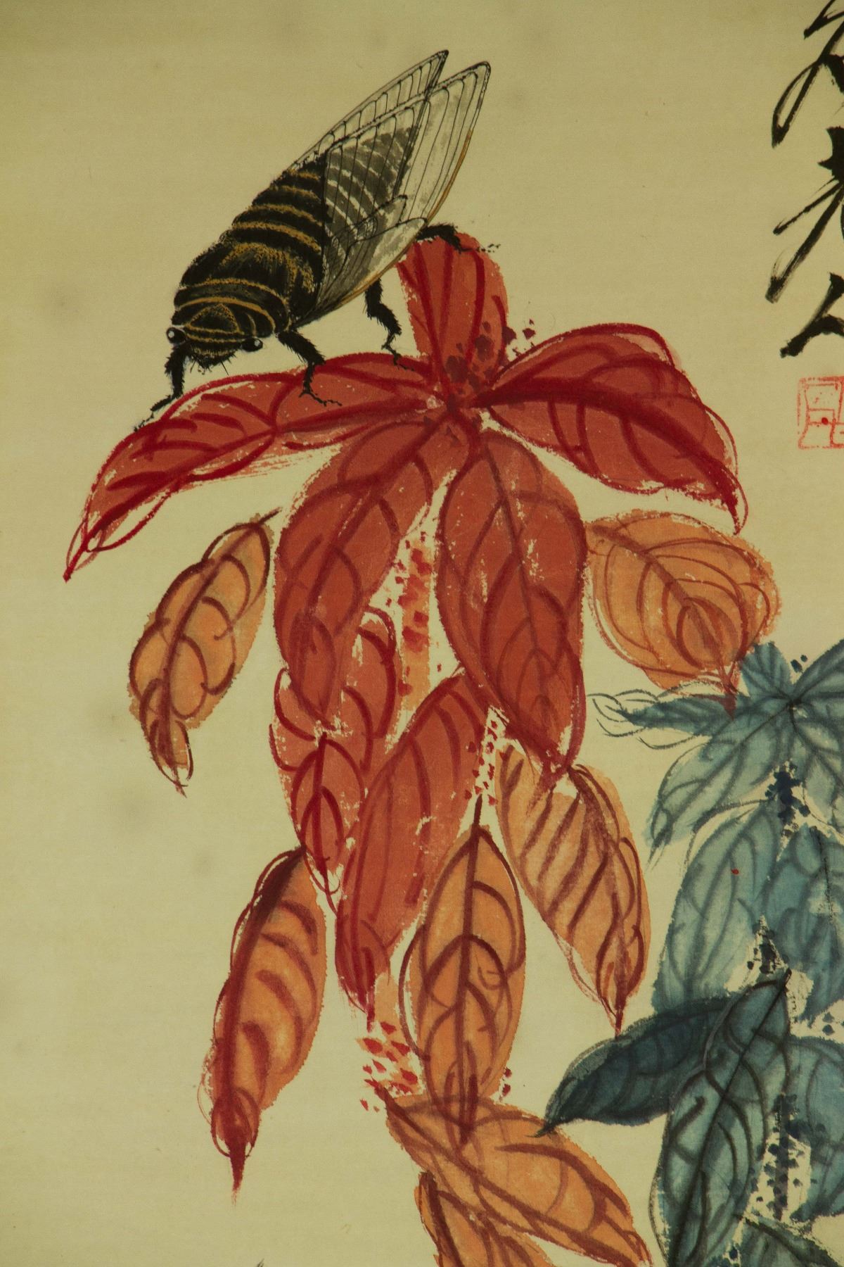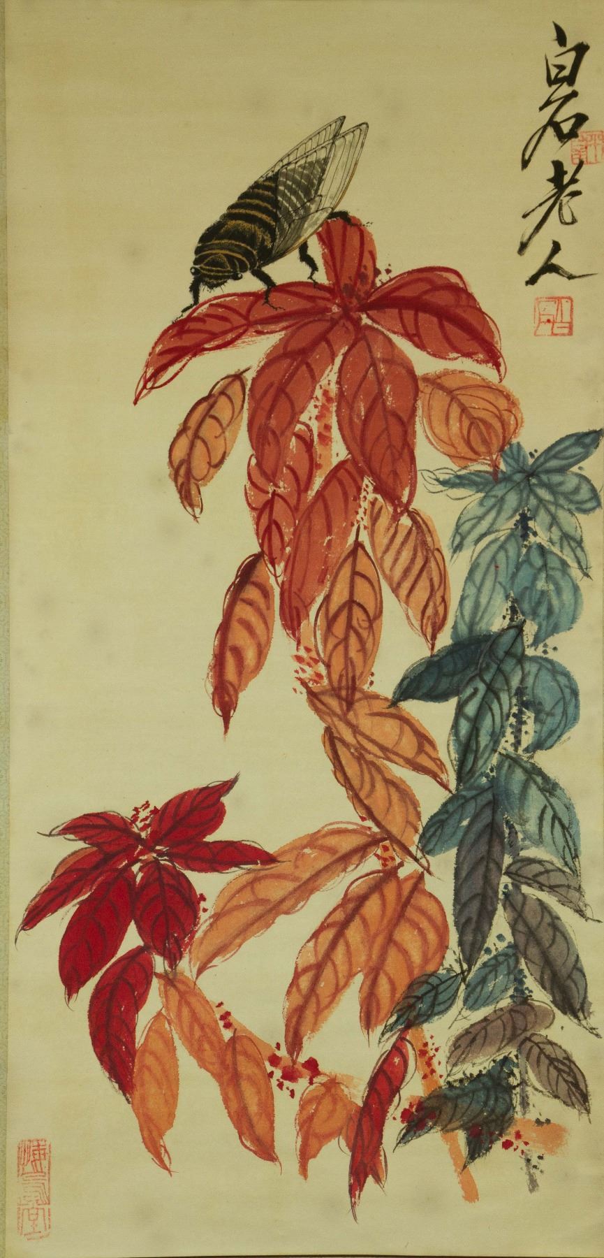 Red leaves and cicada; Chinese ink and watercolour on paper; hanging scroll; signed Qi Baishi (1864-1957); inscribed with 3 artist seals; 132 cm × 57 cm