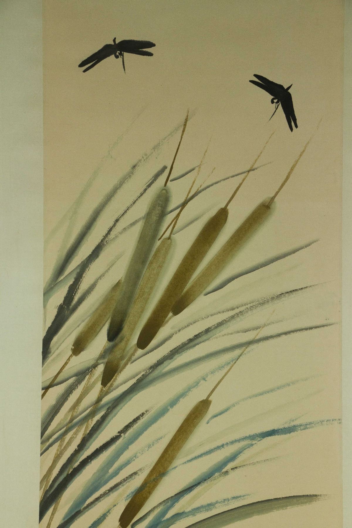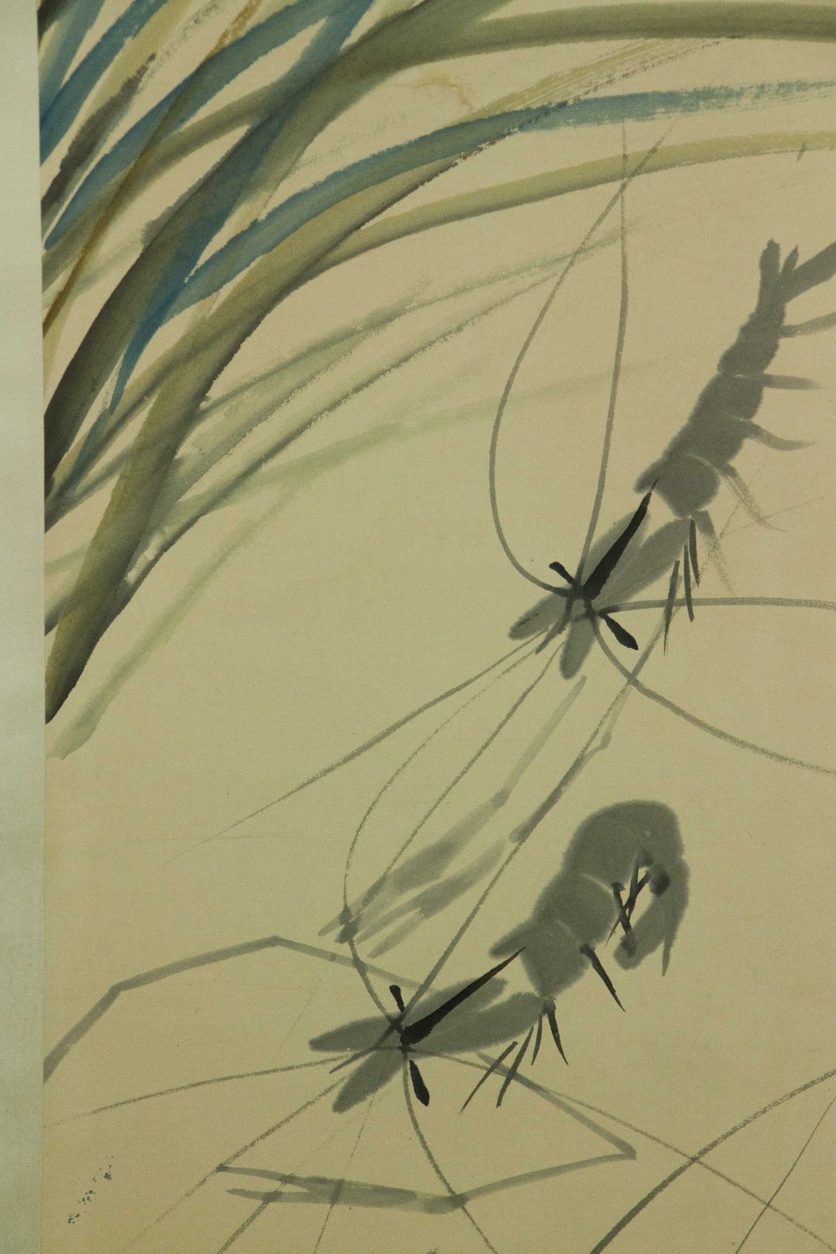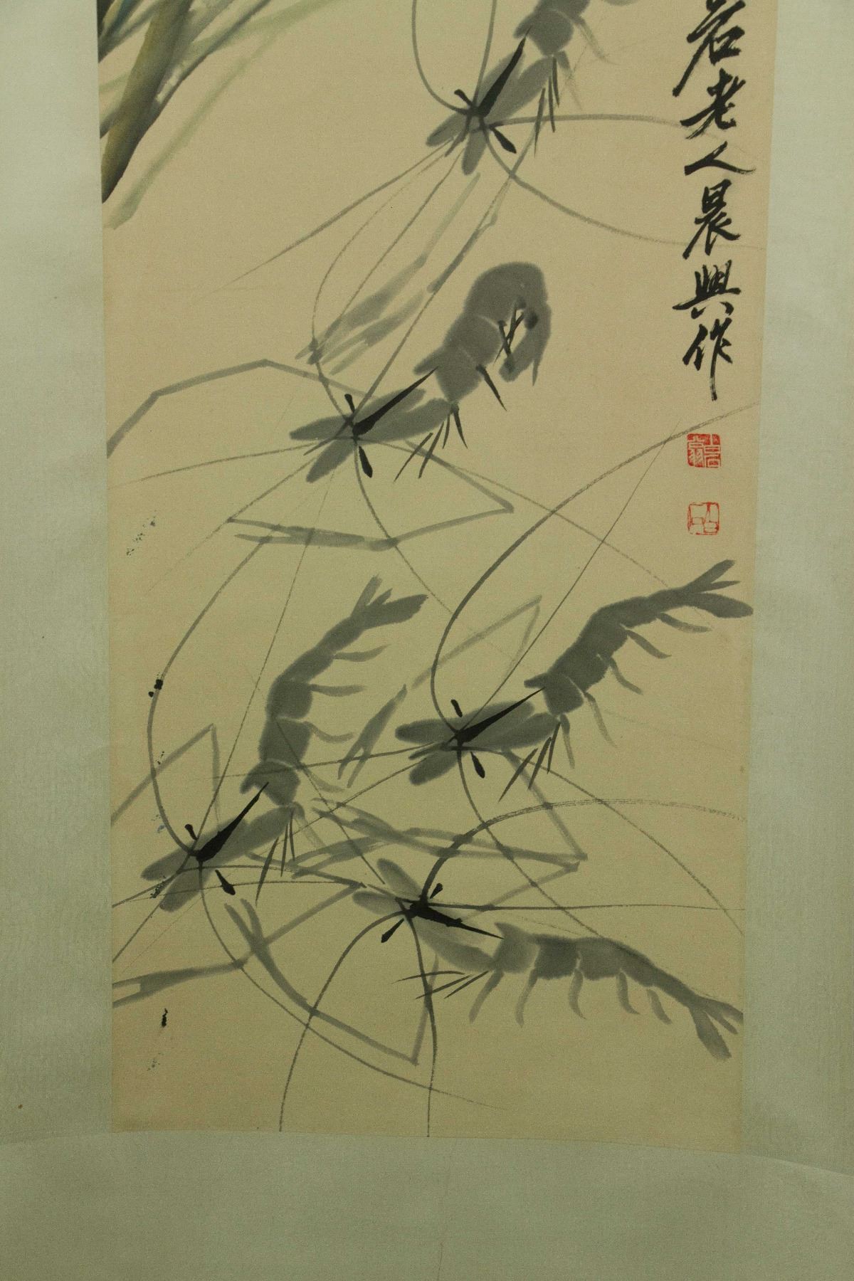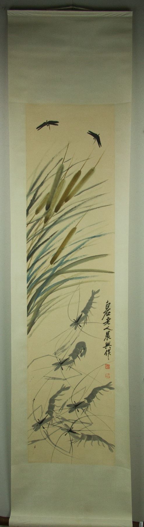 Cattail and shrimps; Chinese ink and watercolour on paper; hanging scroll; signed Qi Baishi (1864-1957); inscribed with 2 artist seals; 192 cm × 60 cm