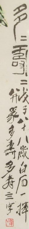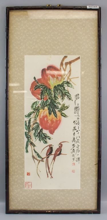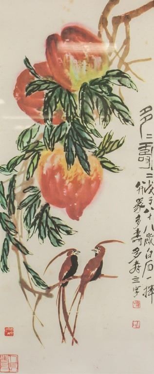 Chinese print on paper, framed. Featuring birds and peaches. Printed "Baishi" in Chinese characters. Inscribed with four seals. 77 x 36 cm.