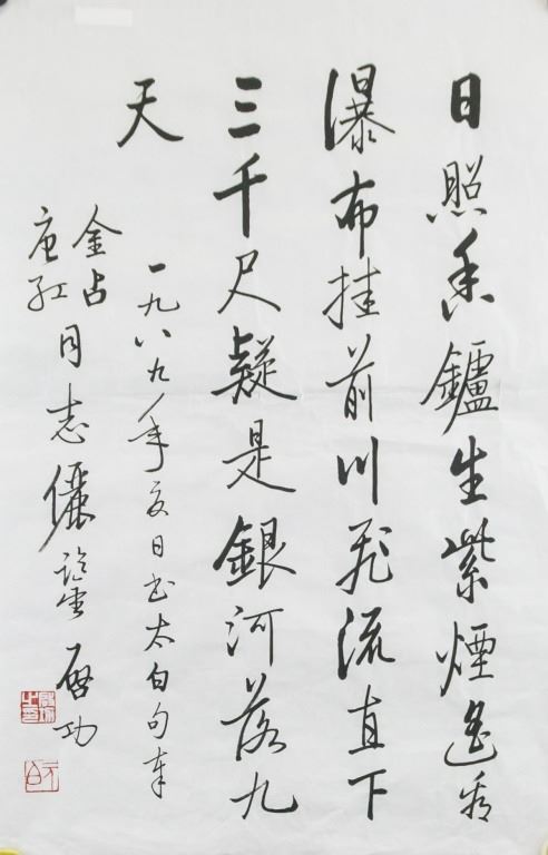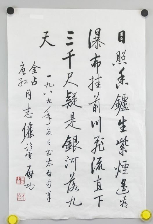 Ink on paper. Featuring Chinese calligraphy. Signed "Qi Gong" in Chinese characters to the left. Inscribed with two artist seals. 69 x 46 cm.