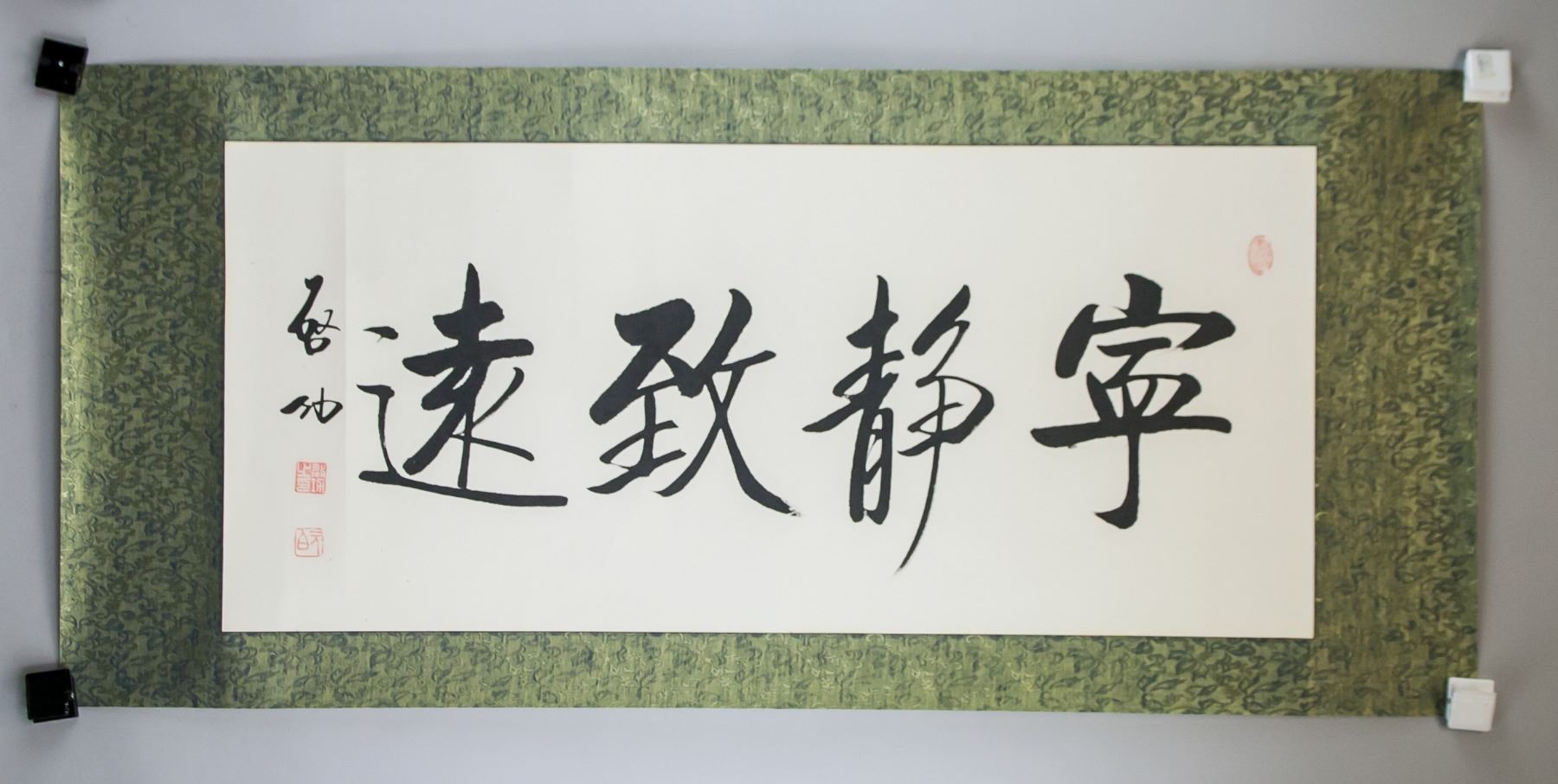 Ink on paper, paper roll. Featuring Chinese calligraphy. Signed Qi Gong (1912-2005, Chinese), inscribed with 3 seals.