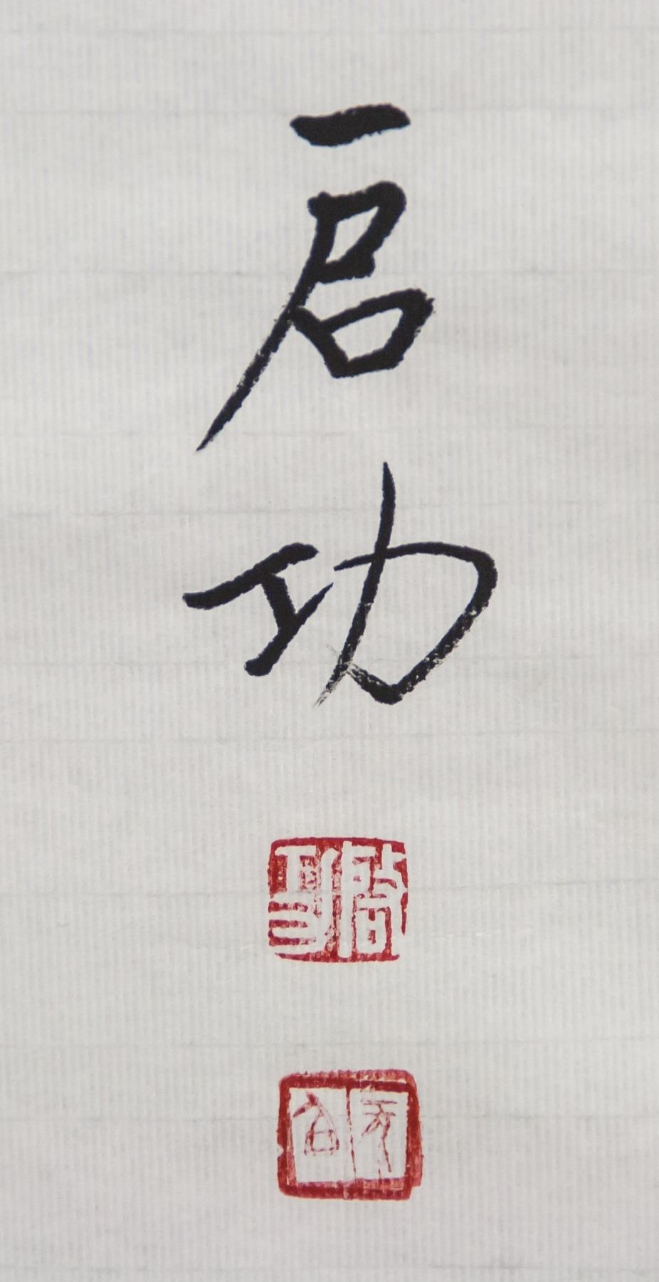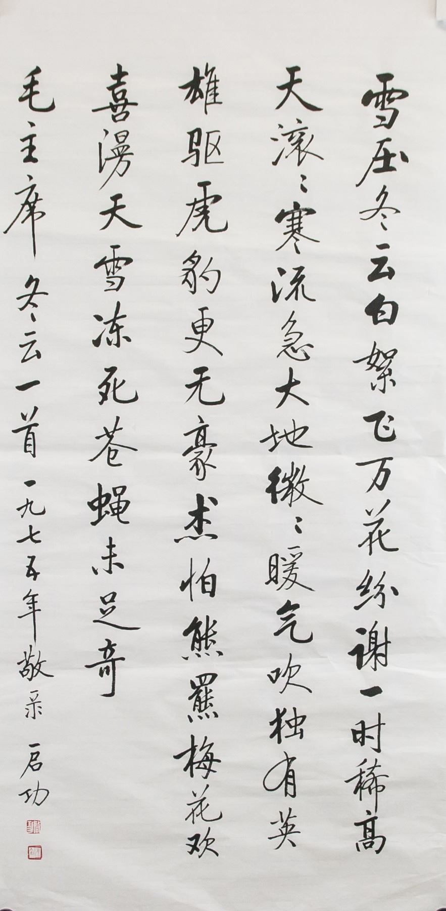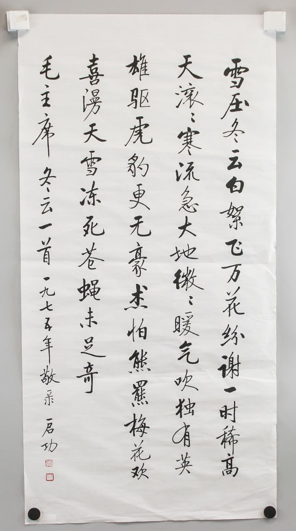 Chinese ink on paper. Featuring Chinese calligraphy. Signed "Qi Gong" in Chinese characters. Inscribed with two seals. Attributed to Qi Gong (1912-2005, Chinese). 98 x 50 cm