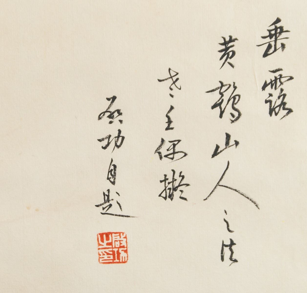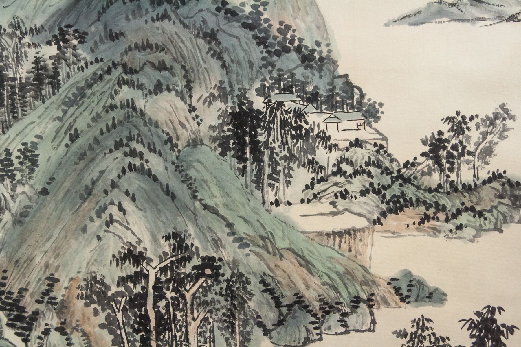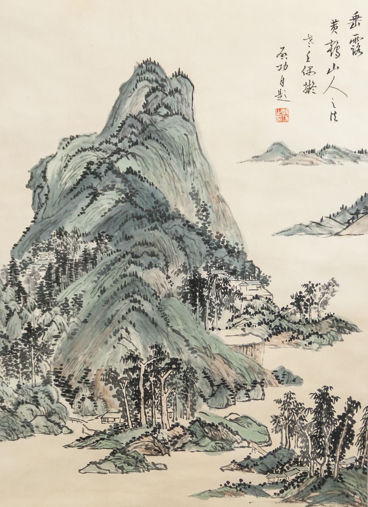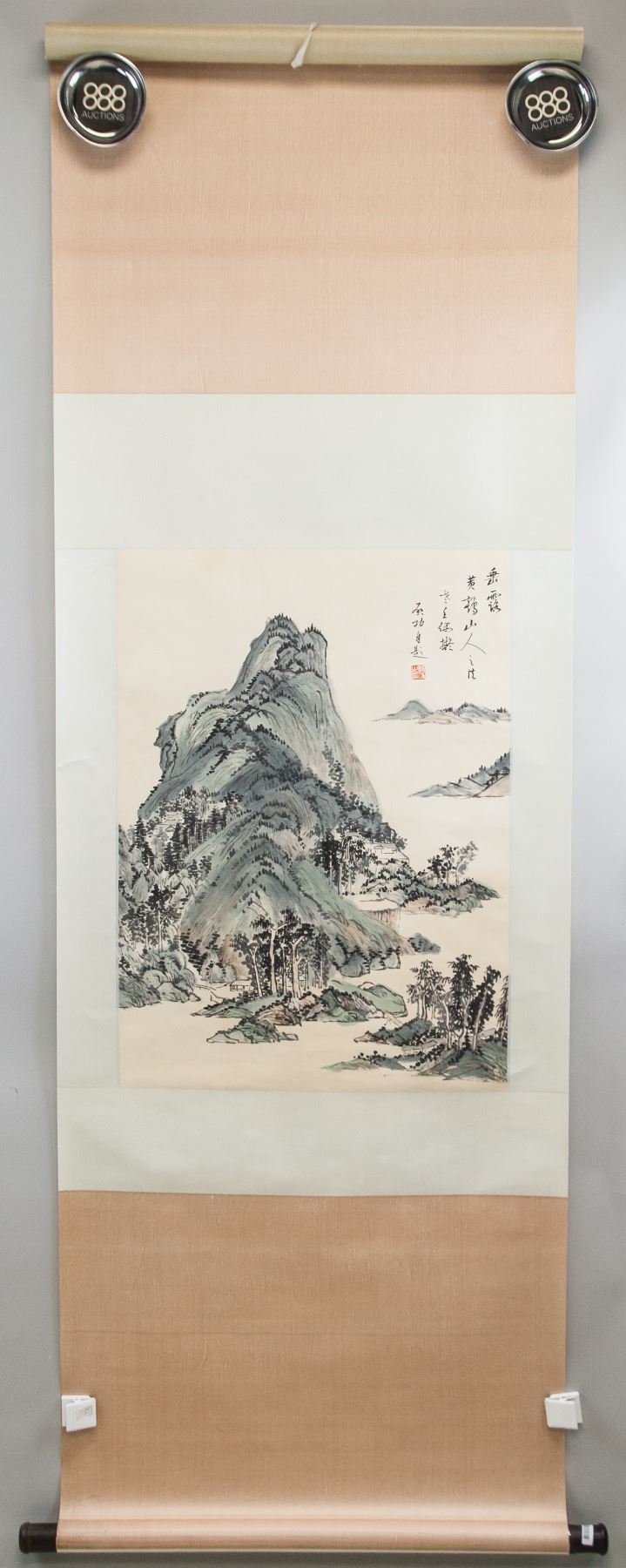 Chese ink and watercolor on scroll. Featuring mountainous landscape. Signed "Qi Gong" to the top right in Chinese characters. Inscribed with one seal. Attributed to Qi Gong (1912-2005, Chinese). 66 x 46 cm.