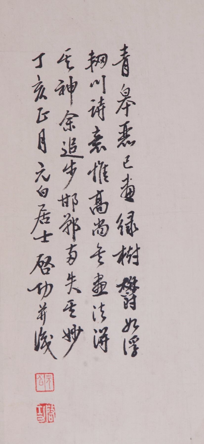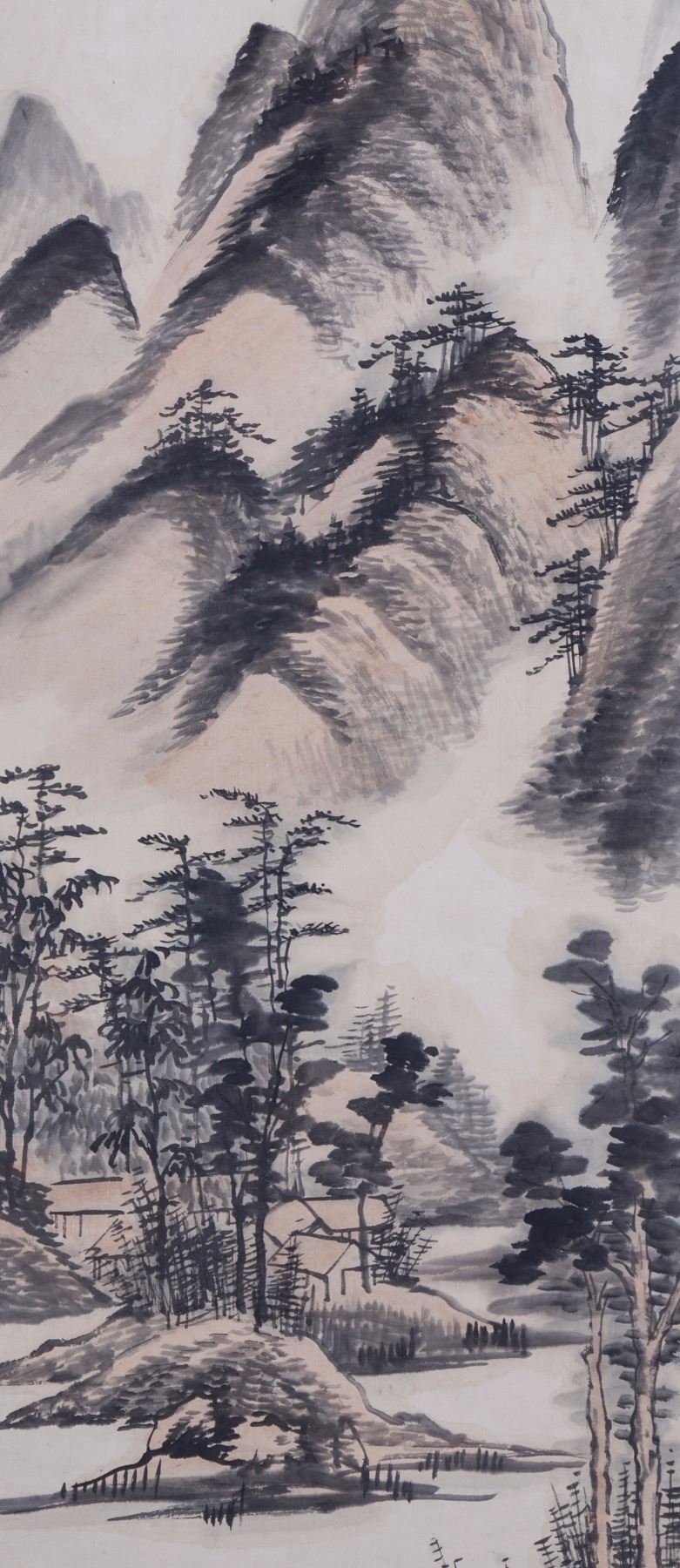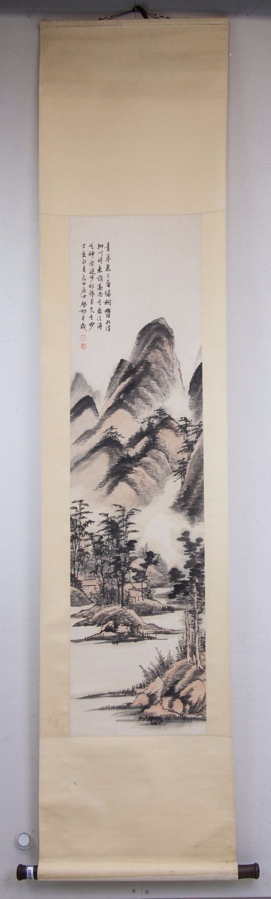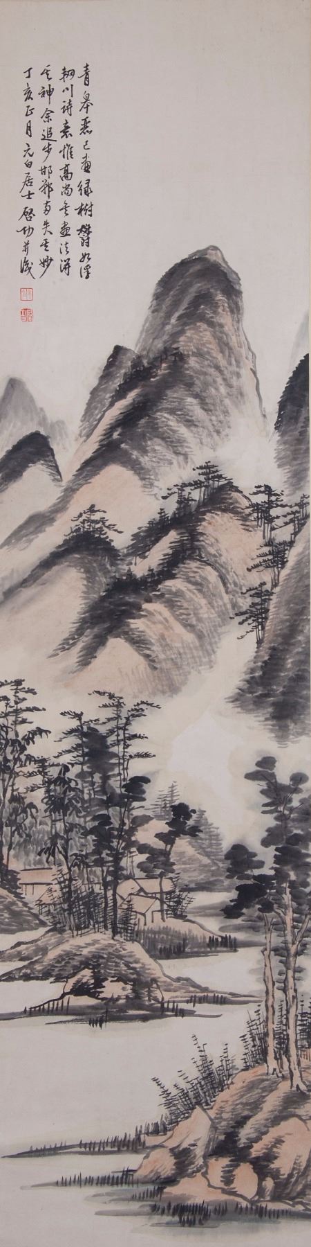 Mountainous landscape; Chinese ink and watercolour on paper; hanging scroll; signed Qi Gong (1912-2005); inscribed with 2 artist seals; 126 cm x 31 cm