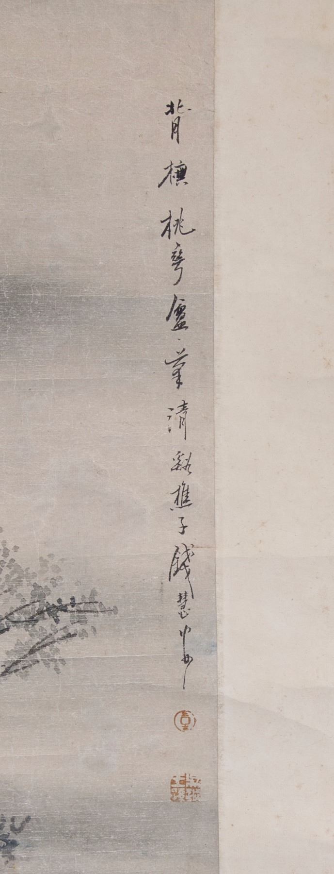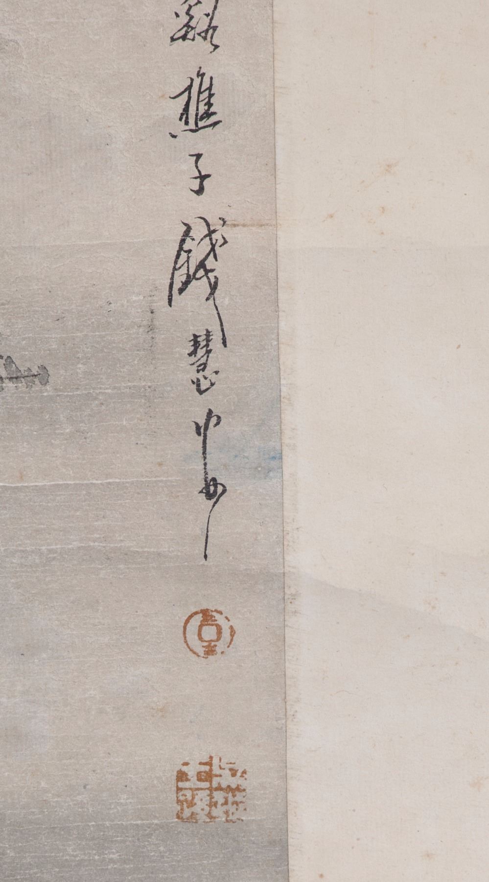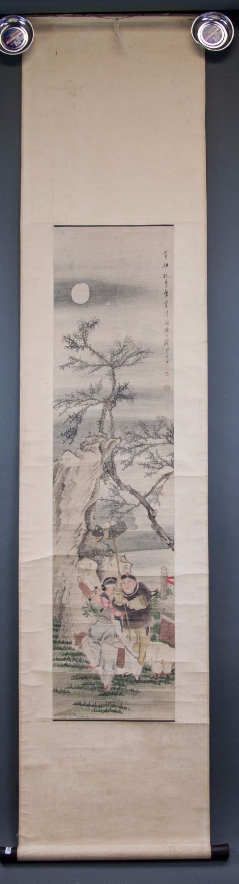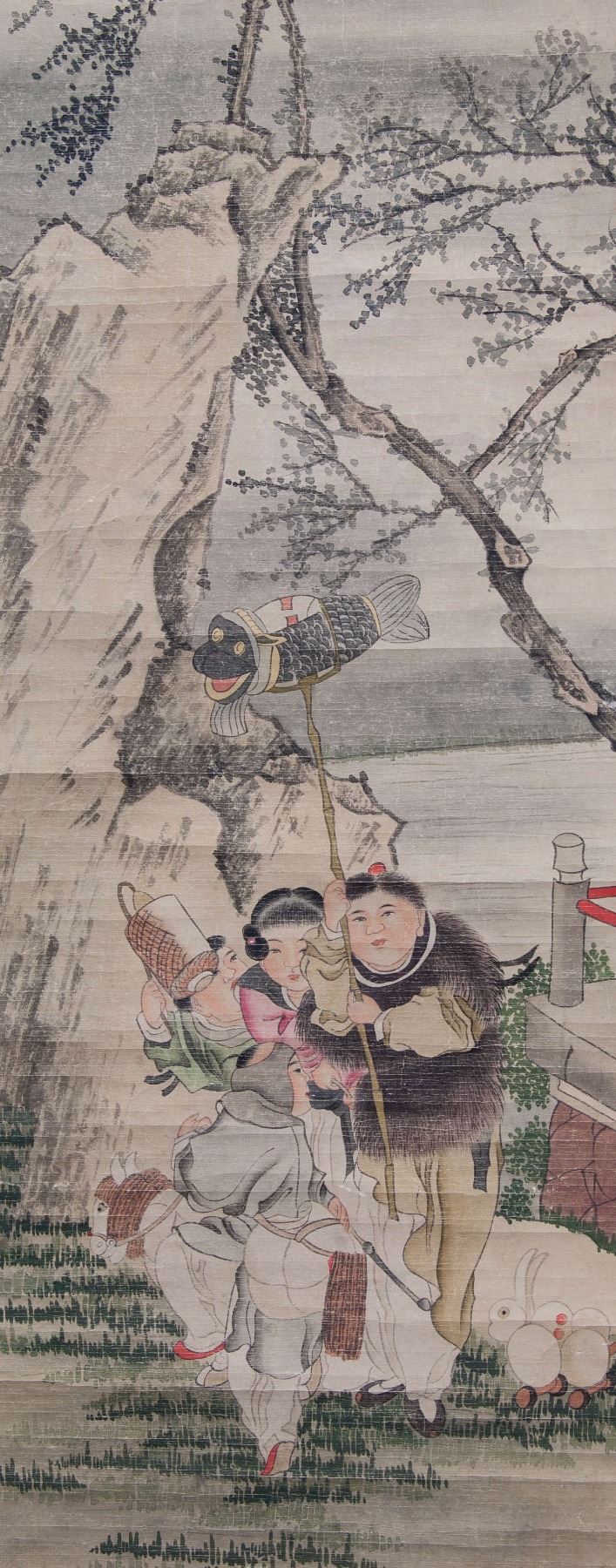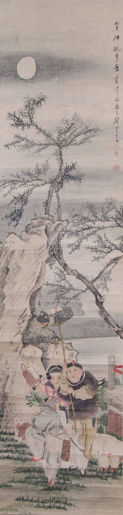 Landscape and children playing scene; Chinese ink and watercolour on paper; hanging scroll; signed Qian Huizhong; inscribed with 2 artist seals; 125 cm x 30 cm