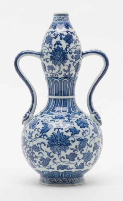 Qian Long marked and period vase in double gourd style in blue white with small mouth, possibly for Persian market as export, approx. 10” in height; with letter of appraisal and authentication from Meili Museum signed by Curator Larry Kirkwood,recognized expert and author. Est.: $600-$1,200.