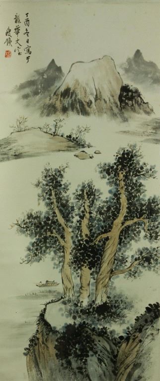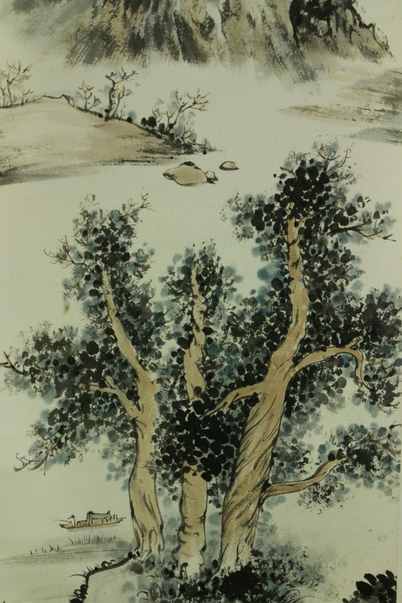 Riverside landscape; Chinese ink and watercolour on paper; hanging scroll; signed Qian Shoutie and inscribed with one artist seal; 80 cm x 36 cm